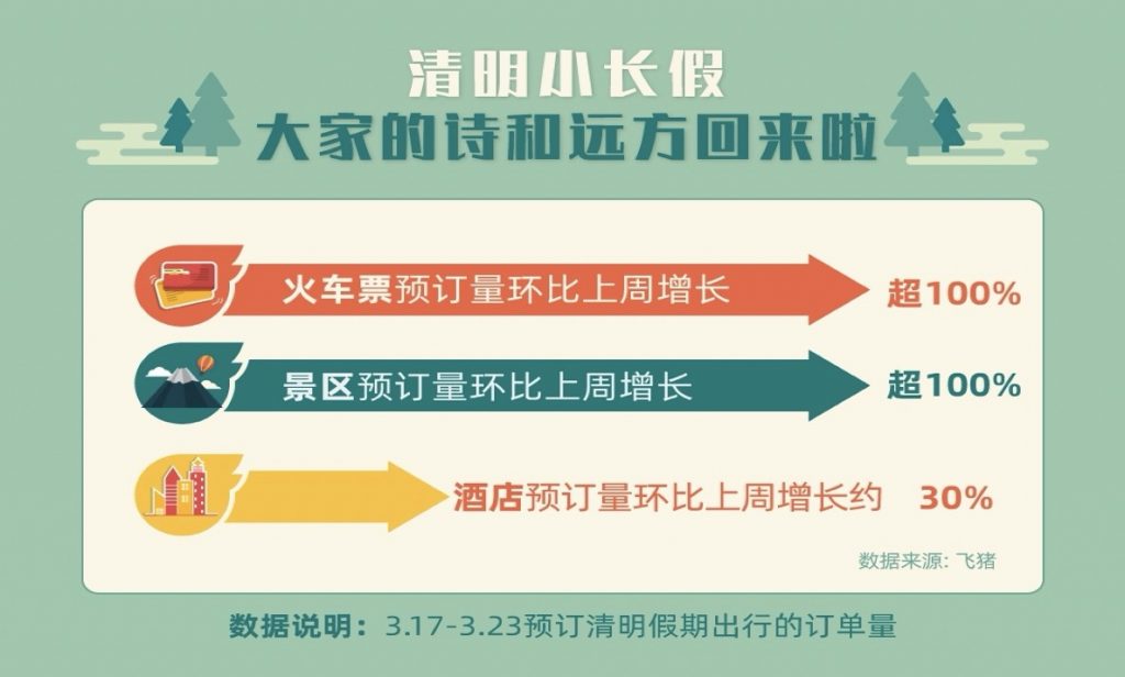 飞猪数据显现,3 月 17 日至 23 日期间,清明假日火车票和景区的预定量环比 1 周前增加超 100%,大都预定为省内车段,酒店预定量环比增加约 30%。寻求诗意不用去远方,这次就在家门口。