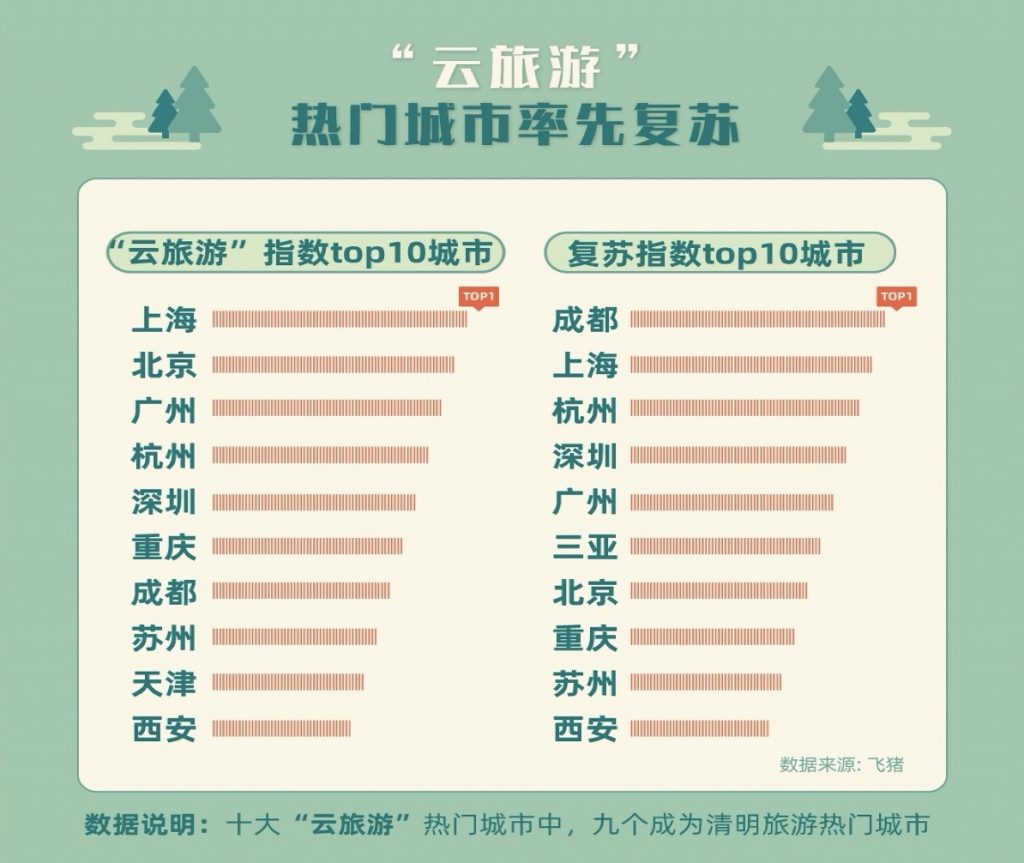 3 月 25 日,飞猪发布的《清明小长假旅行复苏力陈述》显现,清明出游抢手城市九成是“云旅行”抢手城市,旅行复苏从云端走到线下,大批用户方案清明走出家门,“拔草”云旅行场景里的网红酒店、乐土和景区,郊游赏花看动物。